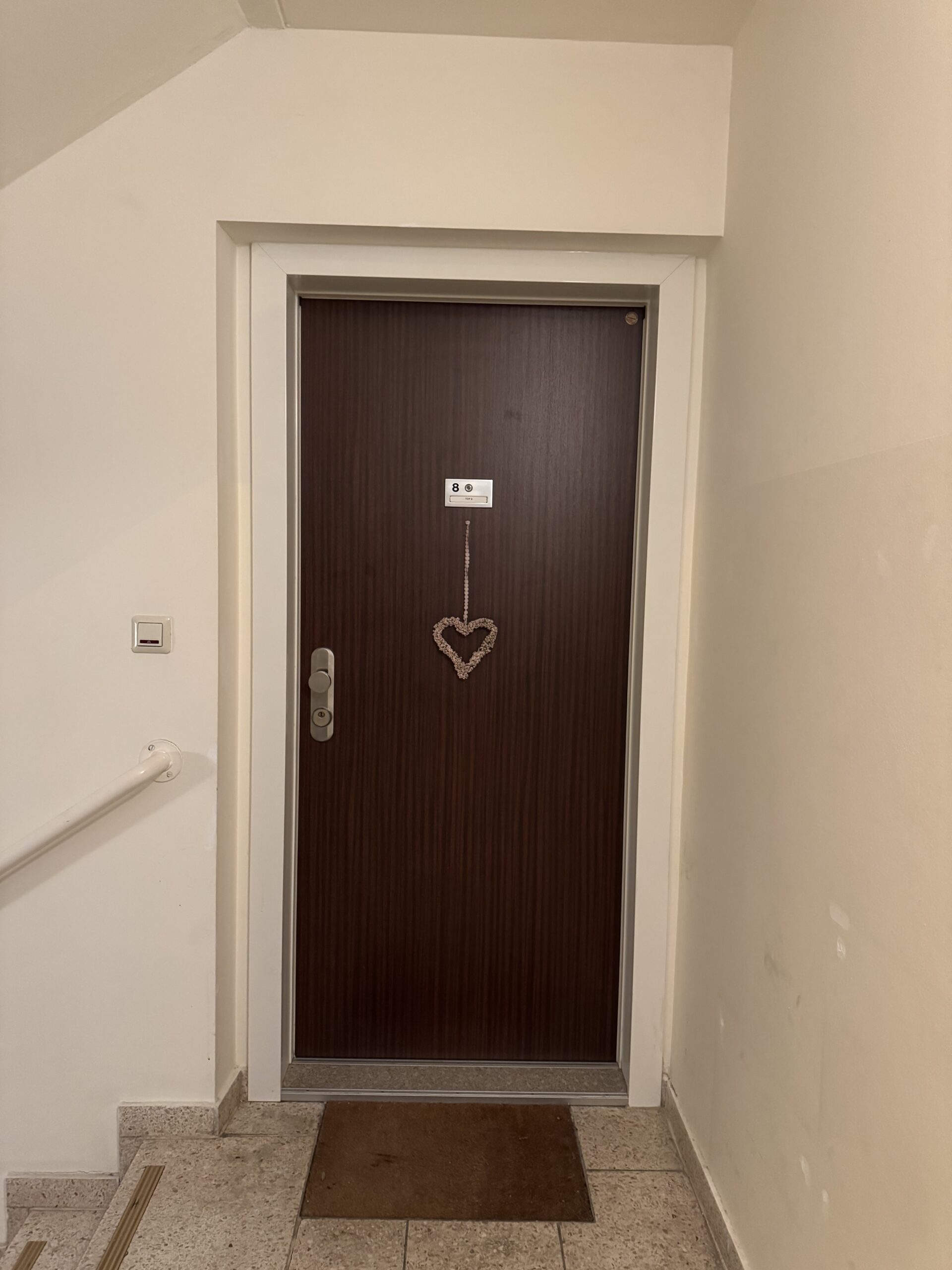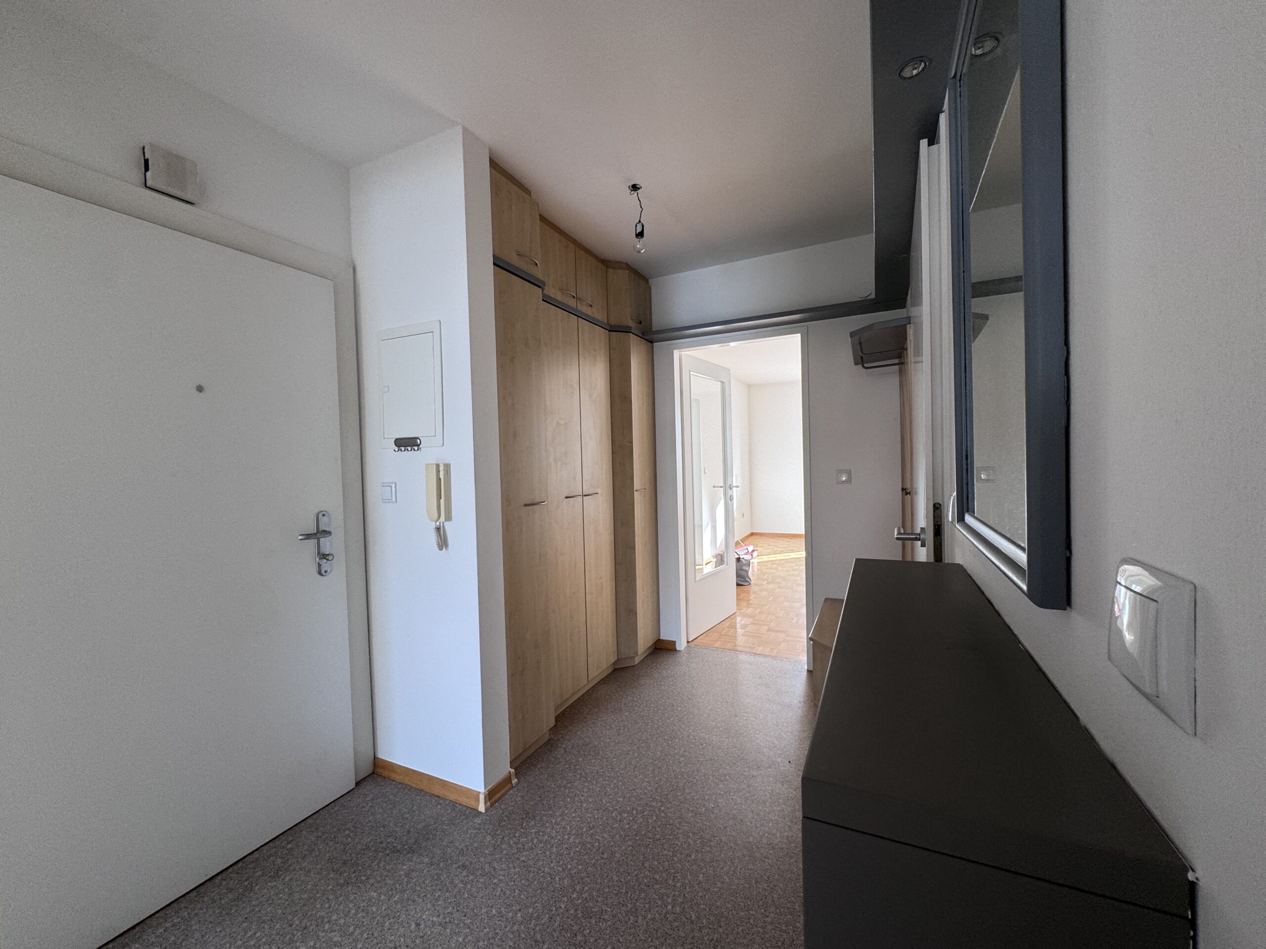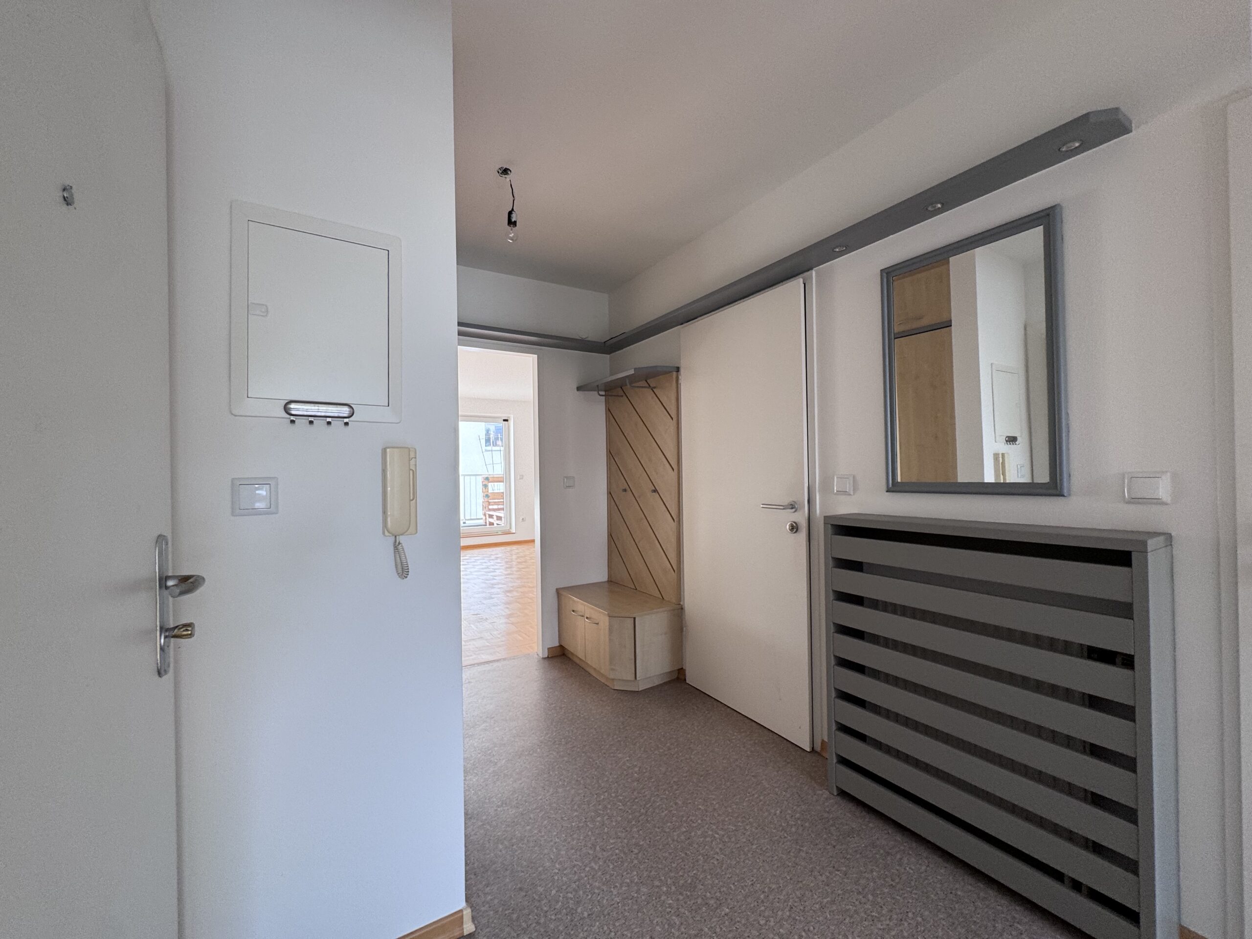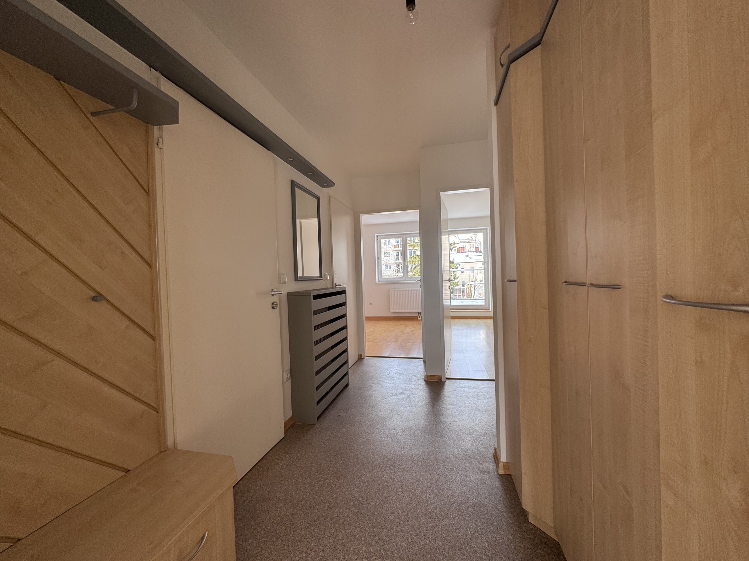 Die Wohnung Top 8 im 5. Stock (gezählt ab Erdgeschoß), punktet mit einer durchdachten Raumplanung, sanierten Feuchträumen und einer neuen modernen Einbauküche. Räumlicher Mittelpunkt der Wohnung ist der großzügige Eingangsbereich mit ca. 7 m2. Links vom Vorzimmer befindet sich das Wohnzimmer mit angrenzender Loggia und die Küche, im rechten hofseitigen Bereich der Wohnung sind zwei Schlafzimmer und der kleine Balkon situiert. Im Vorzimmer wurde über eine Breite von fast 2 Metern ein Einbauschrank nach Maß verbaut und eine passende Kommode ergänzt das Ensemble perfekt.