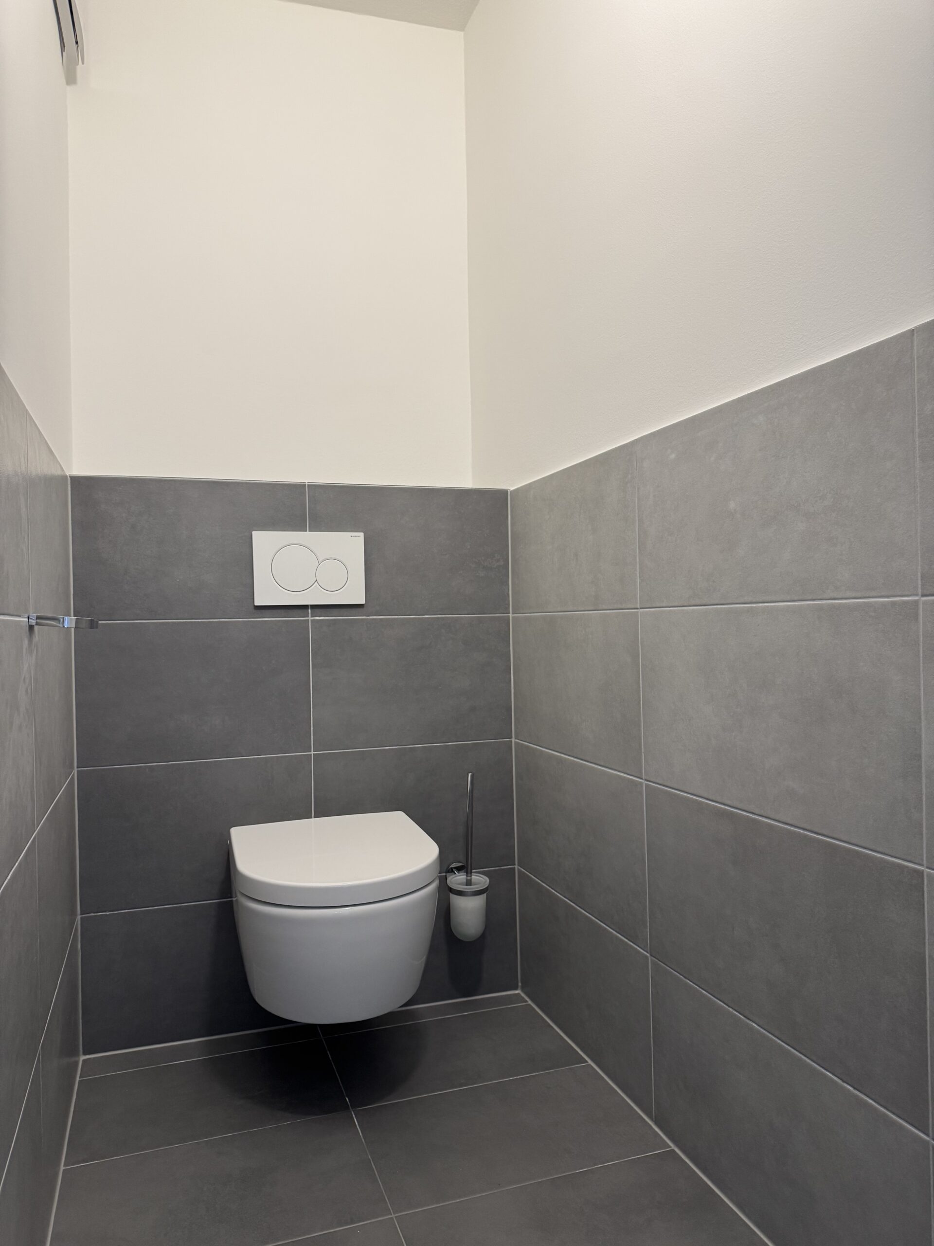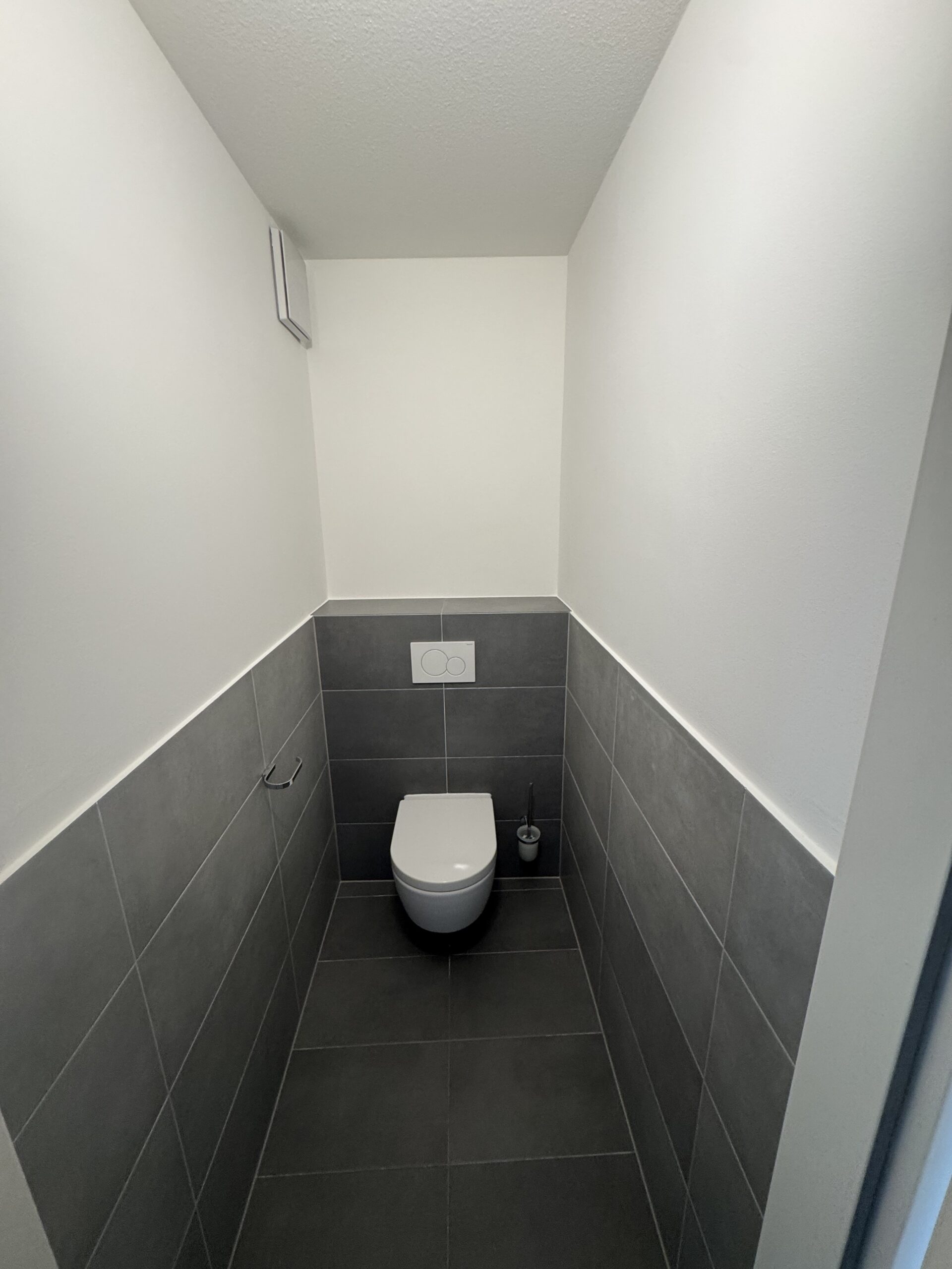 Das Badezimmer als auch das angrenzende WC wurden 2021 vollständig saniert. Neue Fliesen (Feinsteinzeug 30x60 cm) wurden verlegt, hochwertige Sanitärkeramik namhafter Hersteller verbaut und die Badewanne wurde durch eine barrierefreie Stehdusche mit Glaswand ersetzt. Oberhalb des vorhandenen Waschmaschinenanschluss wurde eine Platte in gleicher Optik wie die Badezimmermöbel eingesetzt. Geschmackvolle und funktionelle Badezimmermöbel mit einem Waschbecken Ober- und Unterschrank bieten ausreichend Stauraum und runden die Optik dieses modernen Bades ab.