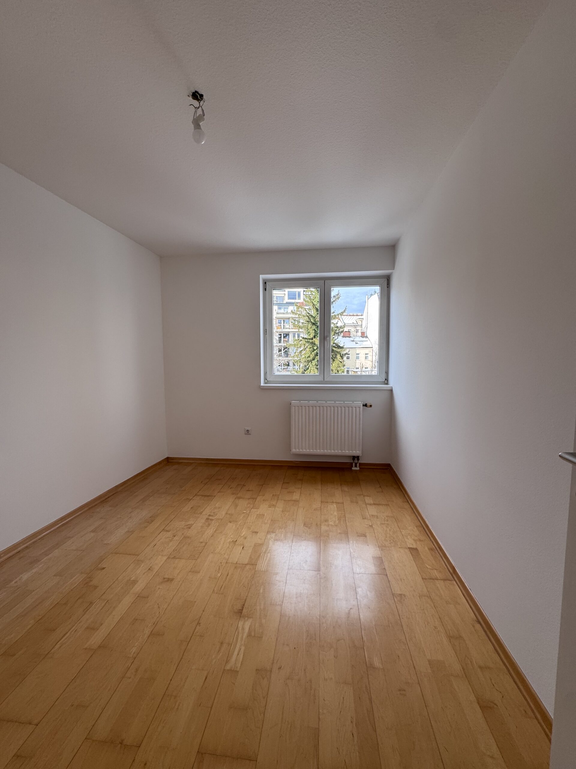 Die beiden Schlafzimmer sind hofseitig ausgerichtet und haben einen wunderschönen Blick auf die Vielzahl von Gärten des Häuserblocks Felbigergasse-Gusenleithnergasse-Hernstorferstraße – Ruhe ist garantiert.. Das kleinere Zimmer hat 10.13 m2 und ein doppelflügeliges Fenster und das größere Zimmer mit 14,77 m2 hat eine Ausgangstür zum Balkon.