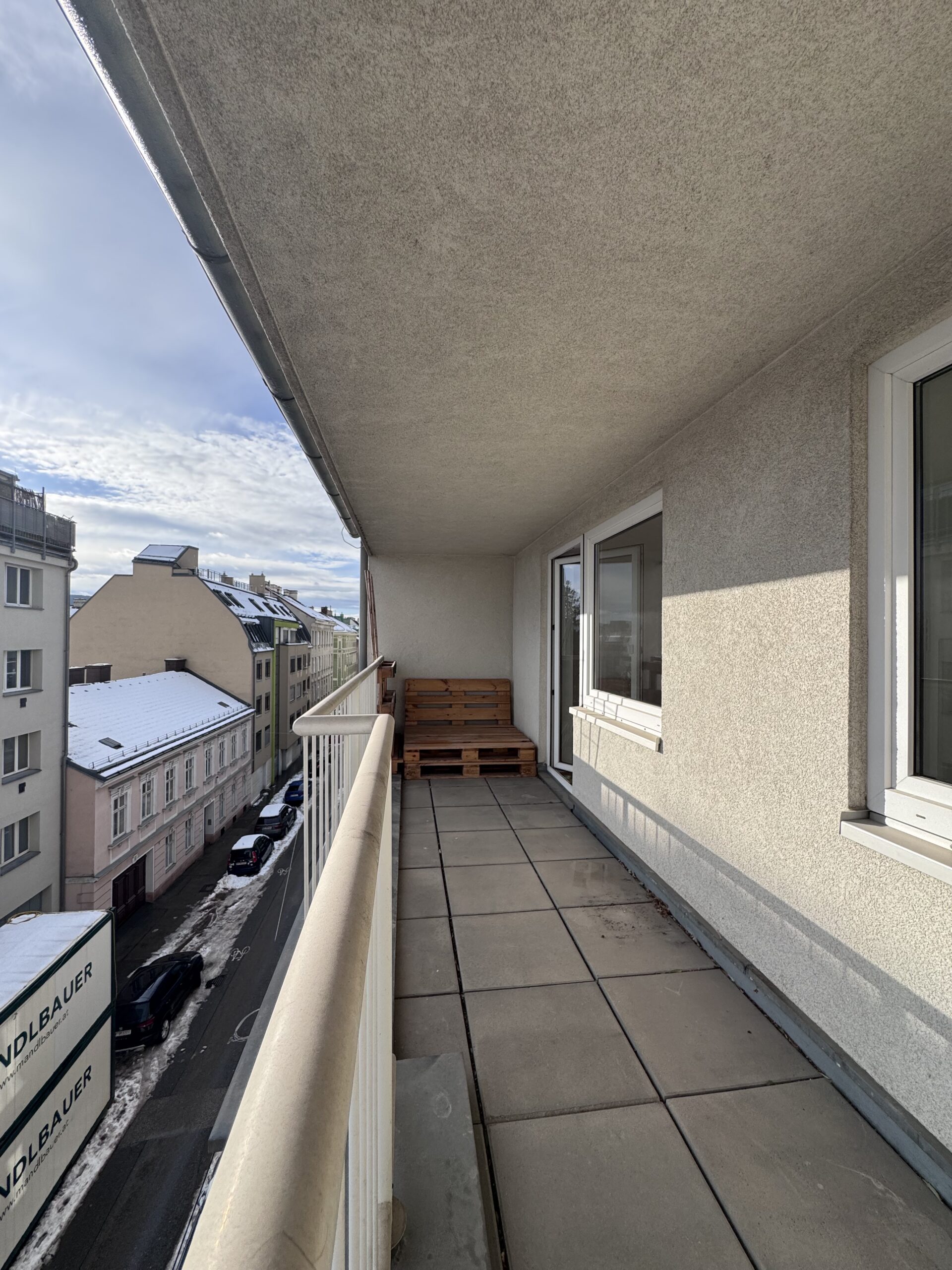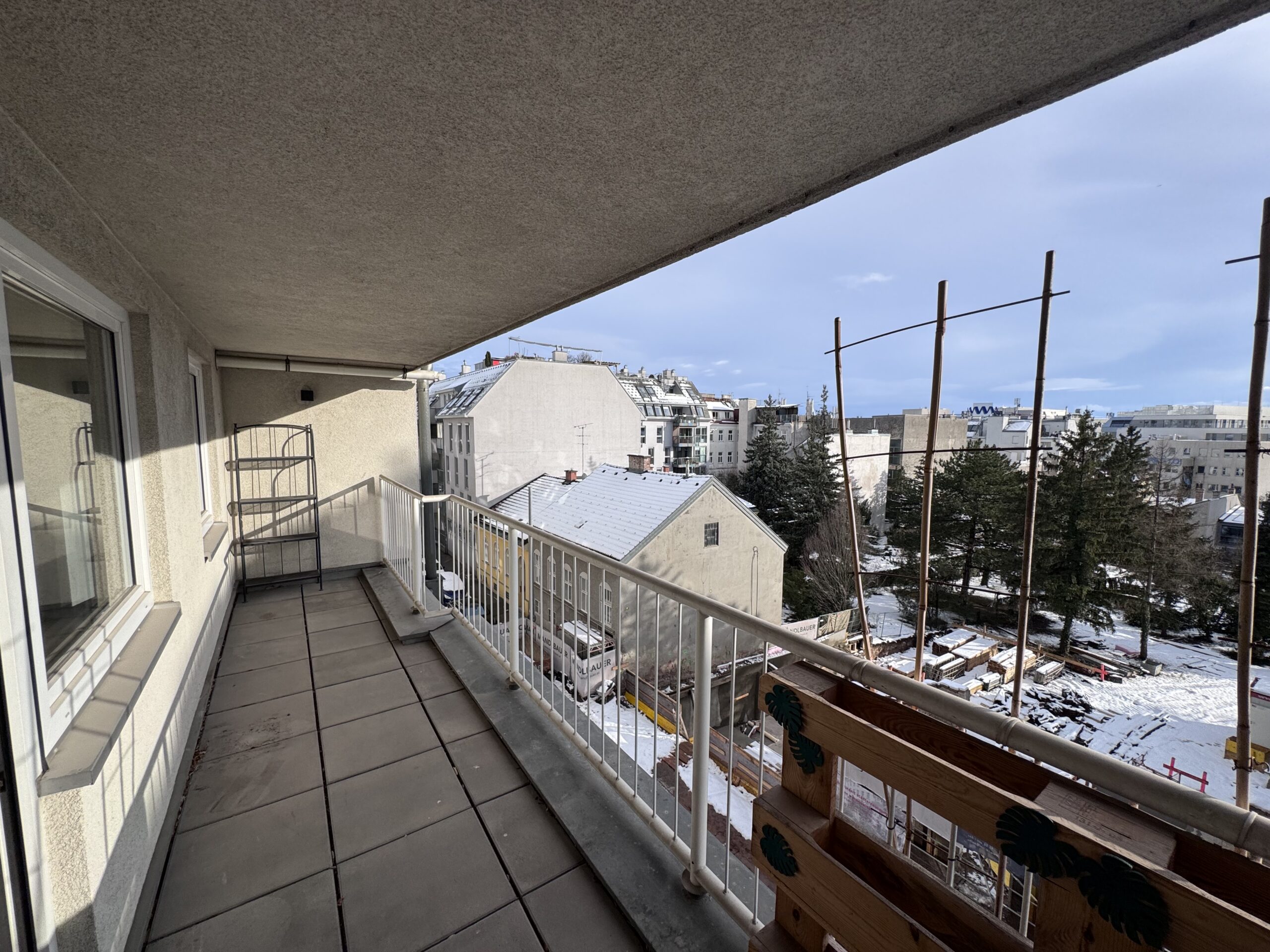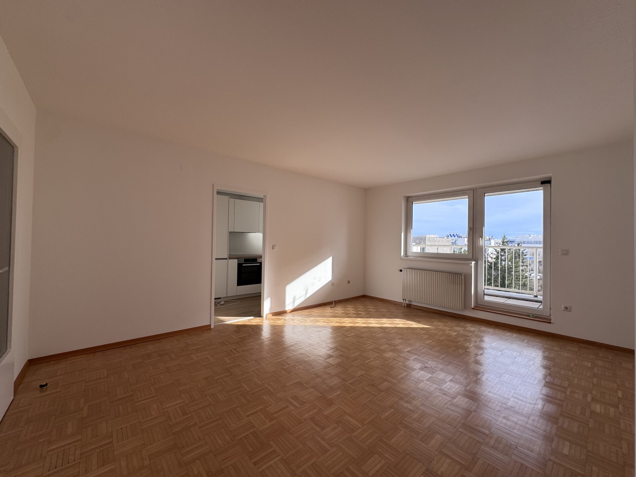 Das Wohnzimmer ist ein lichtdurchfluteter Raum mit ca. 22 m2 – der Wohnraum wird durch die 9 m2 große Loggia erweitert und ermöglicht vor allem in den wärmeren Jahreszeiten ein Leben im „Freien“. Die Loggia mit Blick über die Dächer der Nachbarschaft bietet ausreichend Platz für einen Essbereich und lädt zur Entspannung ein.