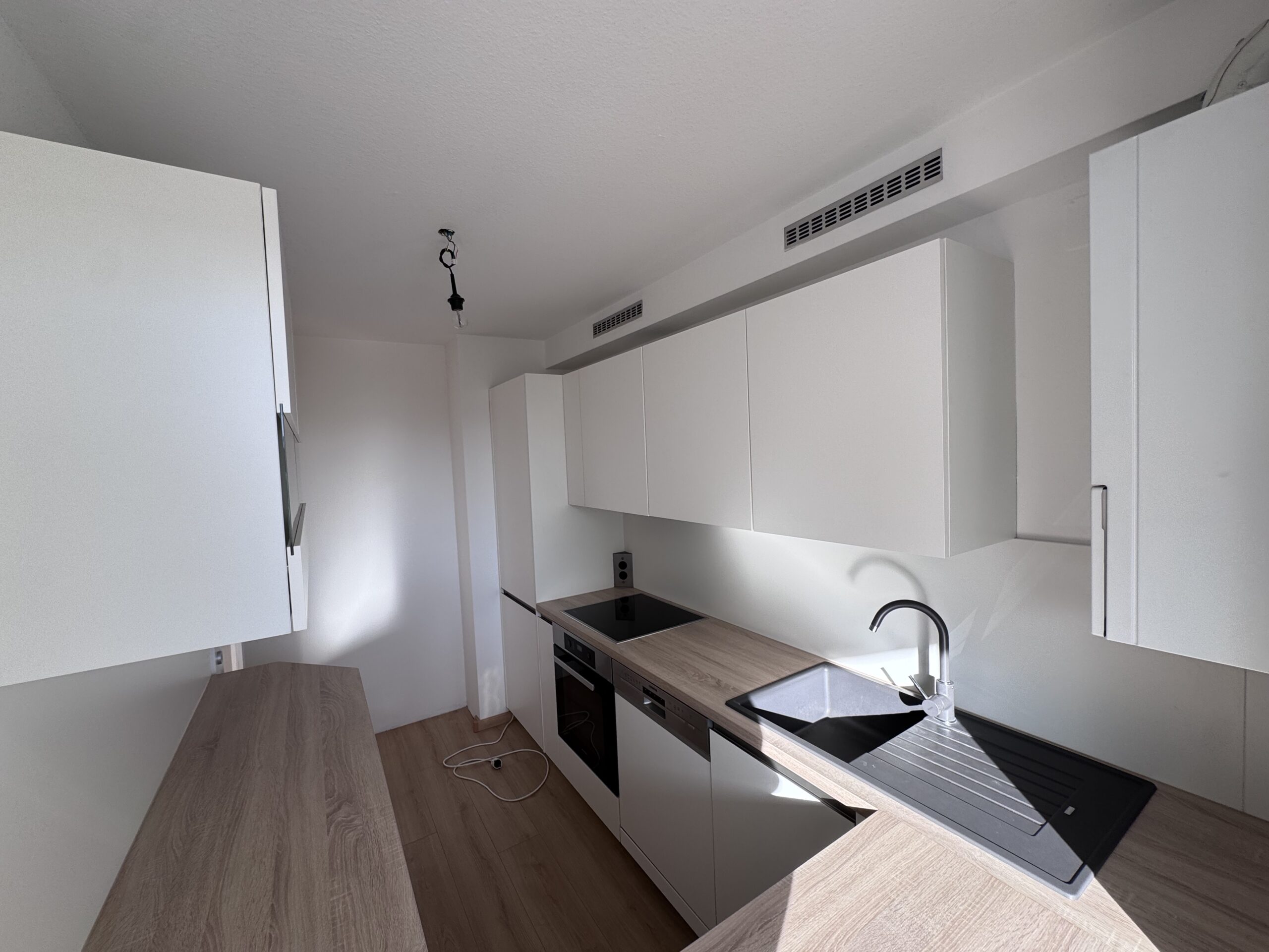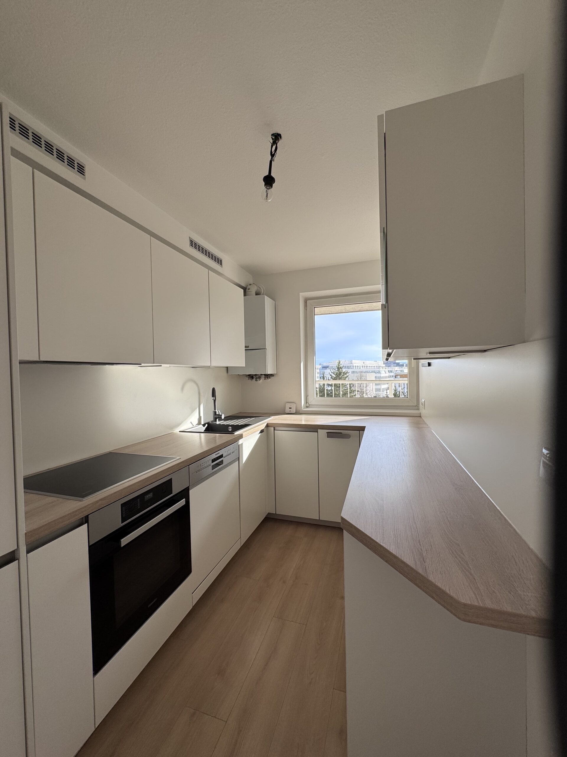Die moderne Einbauküche wird Koch-Enthusiasten und Alltagsnutzer gleichermaßen begeistert. Die ca. 7 m2 große Küche ist ein separater Raum mit großem Fenster zur Loggia und grenzt direkt an das Wohnzimmer. Die gesamte Küchenmobiliar wurde im Jahr 2022 komplett erneuert. Hochwertige Fronten in weiß matter Ausführung, ausreichend Arbeitsfläche in Eichenoptik passend zum Fußboden und die ideale Anordnung von Kochfeld / Backofen (Marke Miele) , Mikrowelle und Geschirrspüler (Marke Siemens) schaffen ein elegantes Gesamtbild und ermöglichen eine komfortable Nutzung.