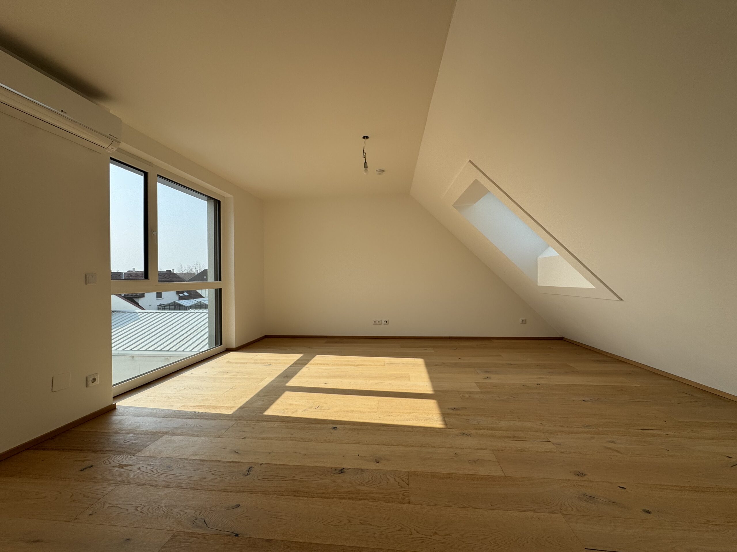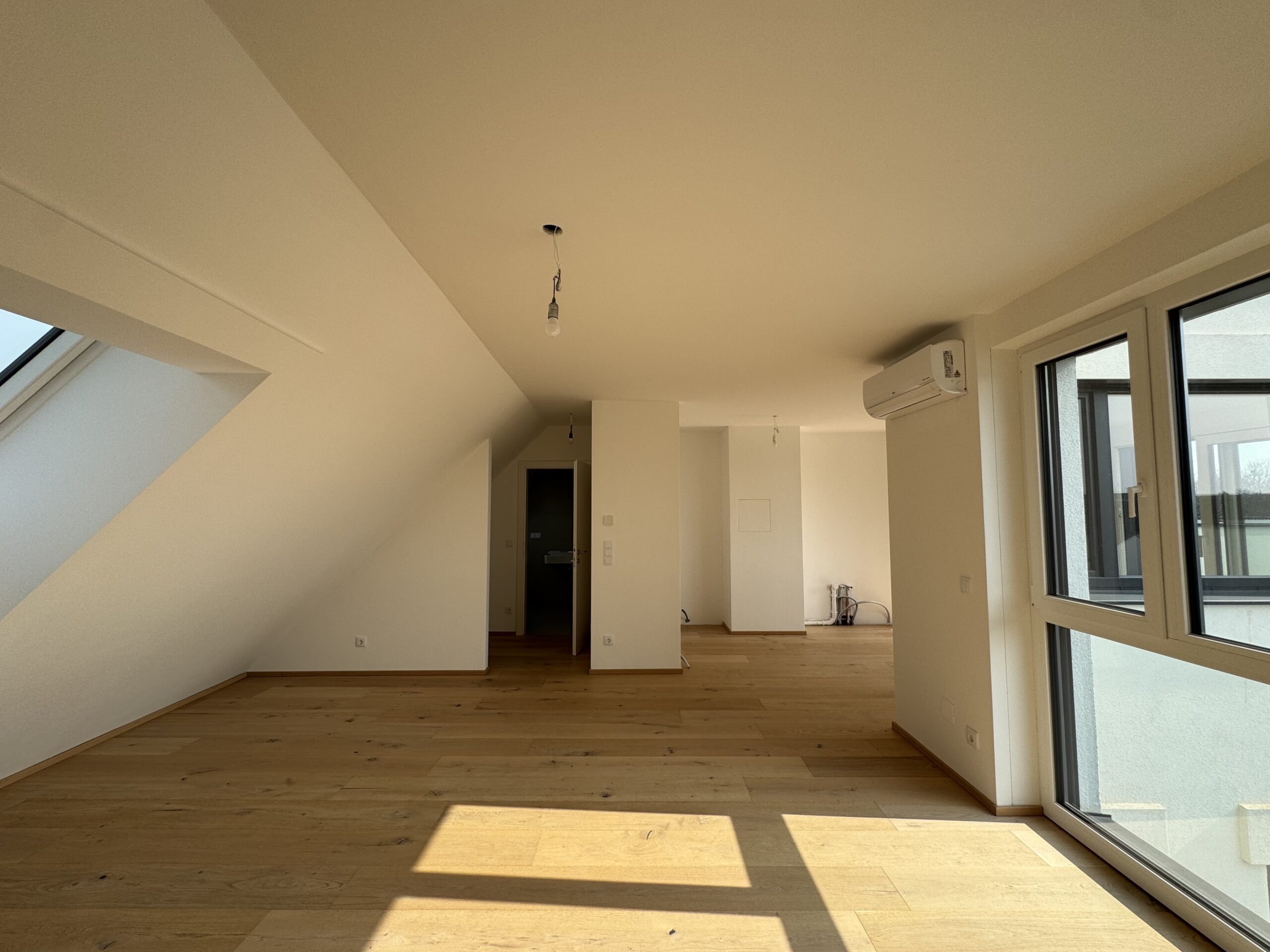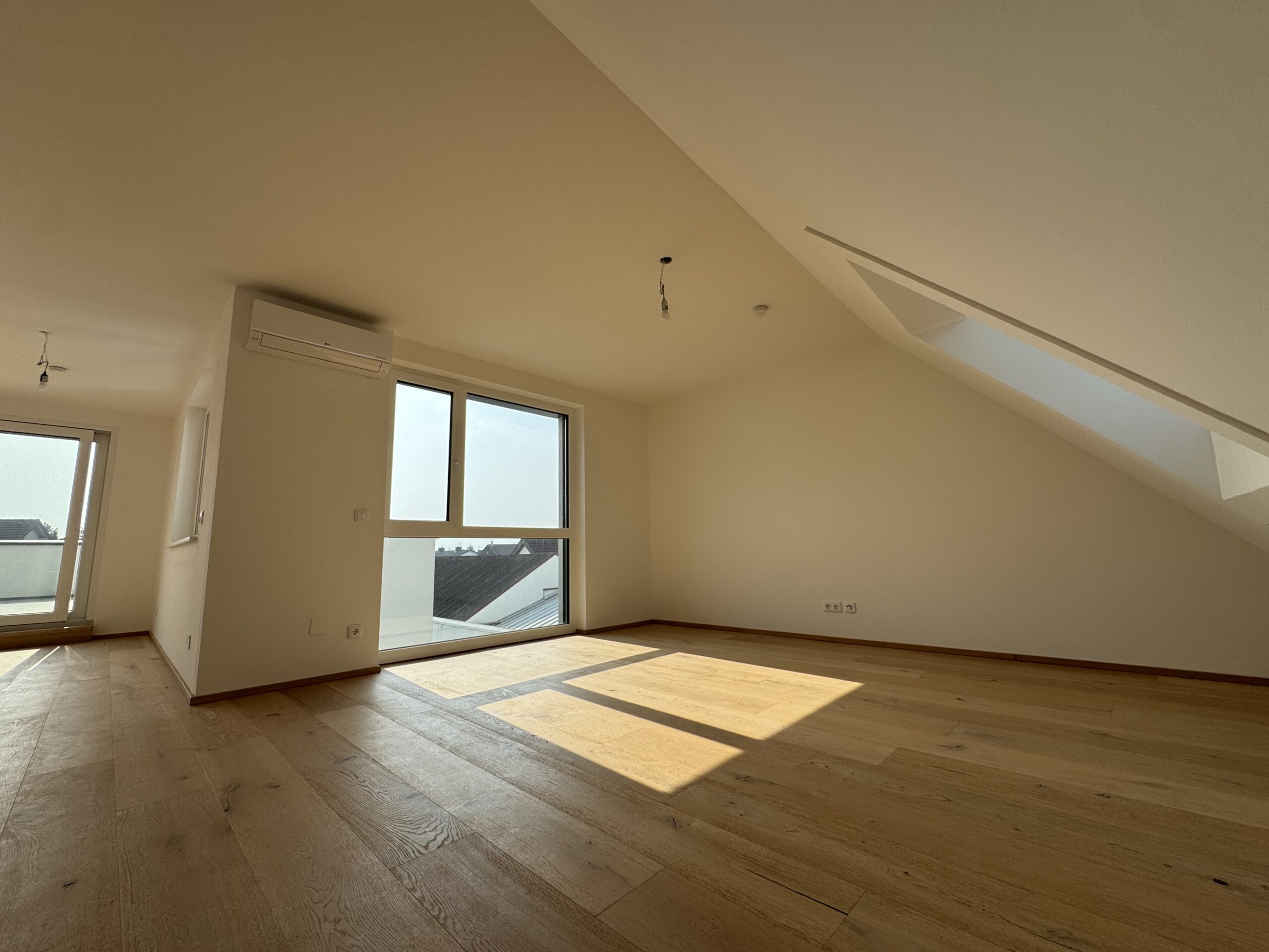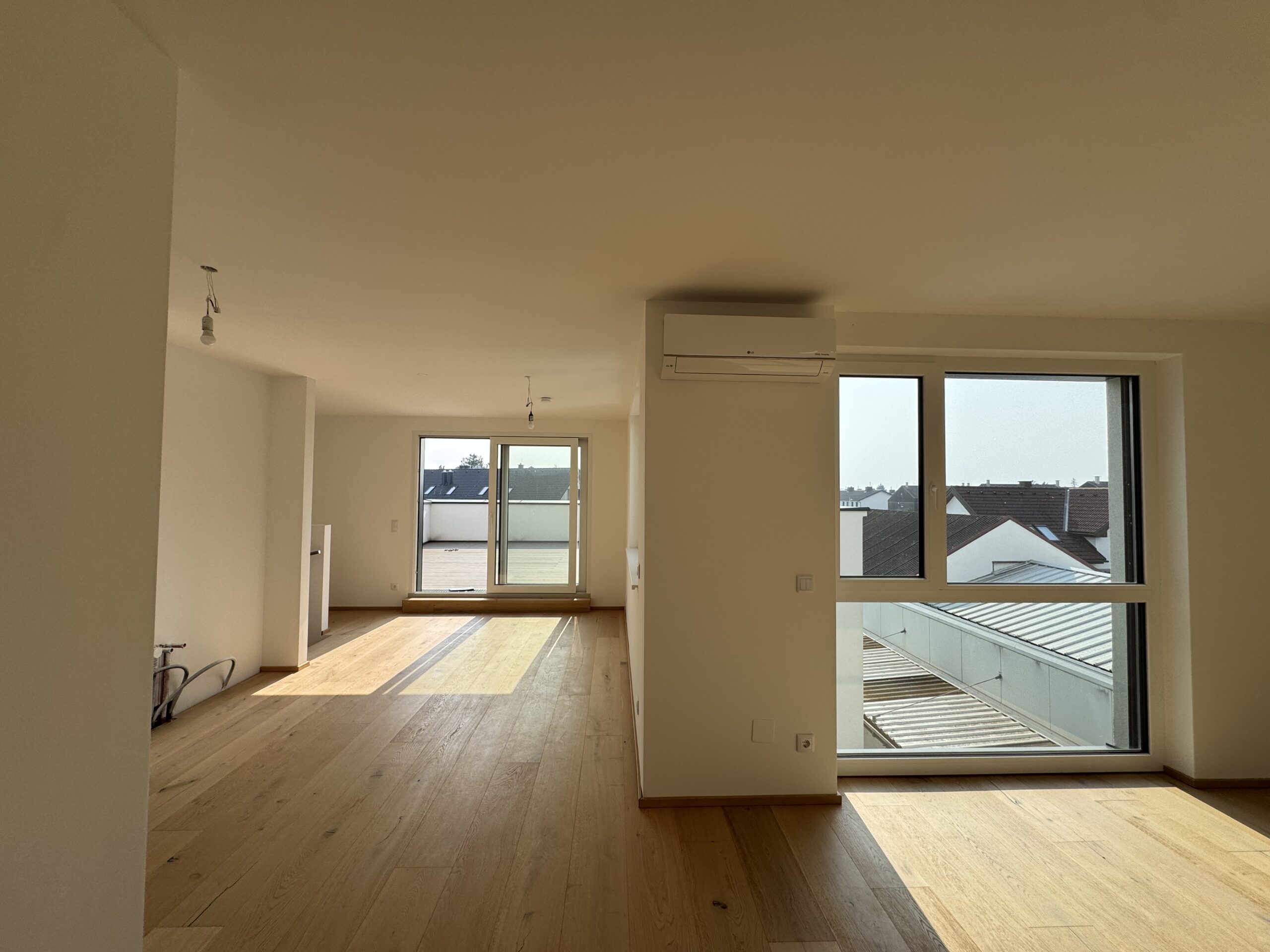 Lichtdurchfluteter Wohnraum mit Hebeschiebetür zur uneinsichtigen 59.58 m2 großen Dachterrasse.