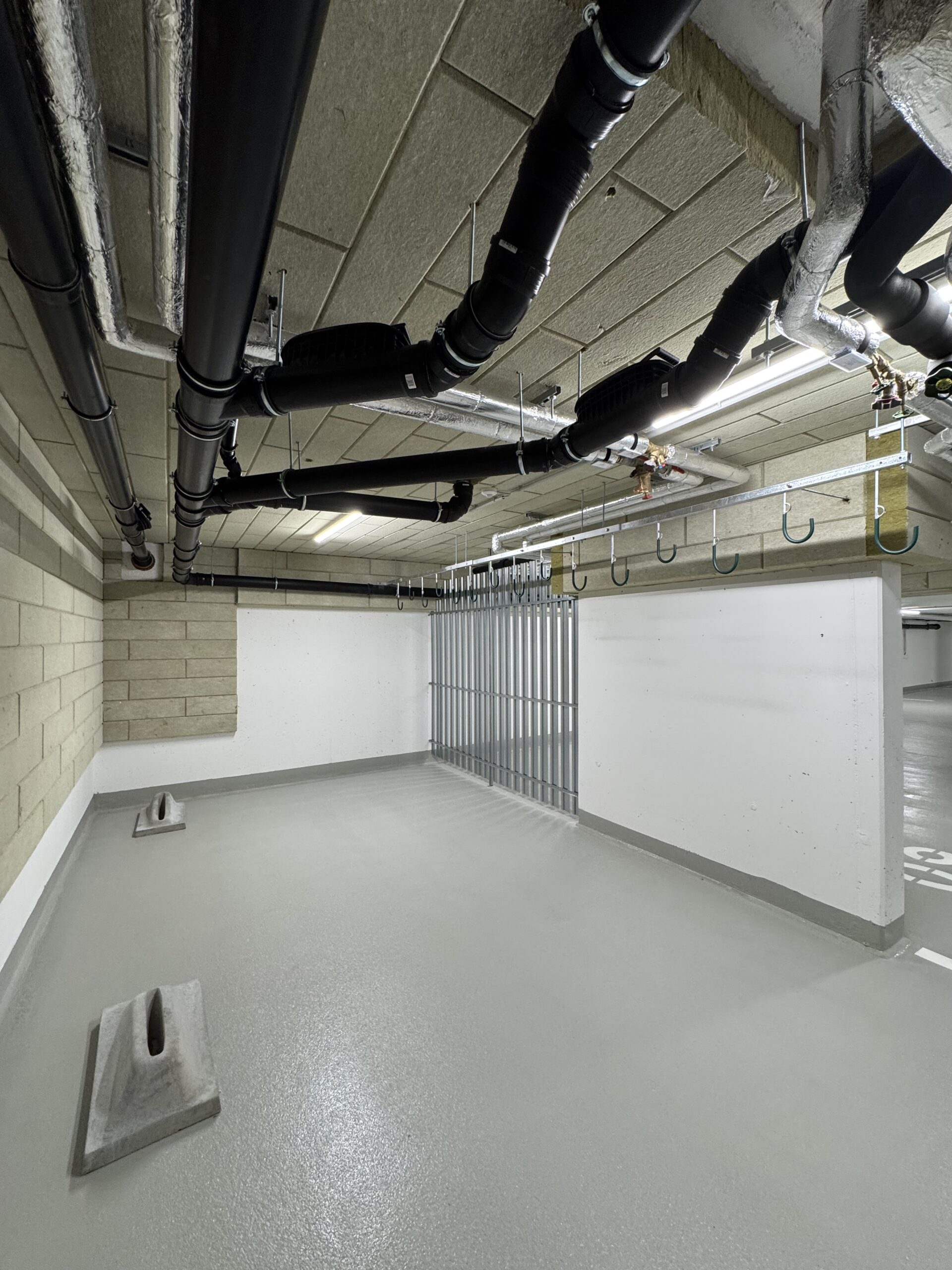 Der Wohnung ist ein Kellerabteil mit 2,05 m2 zugeordnet, ebenfalls im Untergeschoss befindet sich ein Kinderwagenraum. In der Tiefgarage gibt es einen großen Abstellplatz mit Vorrichtungen zum Abstellen von Fahrrädern.
